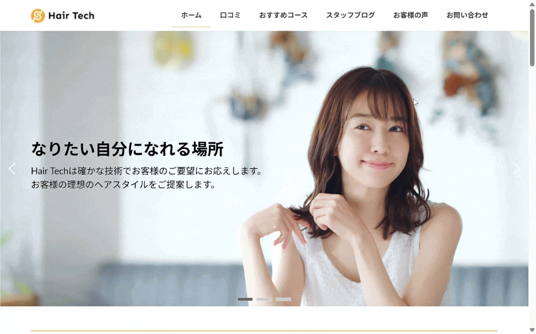 美容室のHP ヘアーサロンのHPになります。 担当 WordPress構築・コーディング サイトの目的 SNS等でリンクをお貼りいただく目的でのサイトになります。 使用技術 WordPress デザインについて 20~30代の女性のお客様が多い店舗のため、お客様の層に最適な画像素材を使用しております。 コーディングについて トップ画面での画像スライド、口コミ情報の表示、GoogleMapでの店舗所在地の表示、お問い合わせフォームなどを実装させていただいております。 Works一覧へ